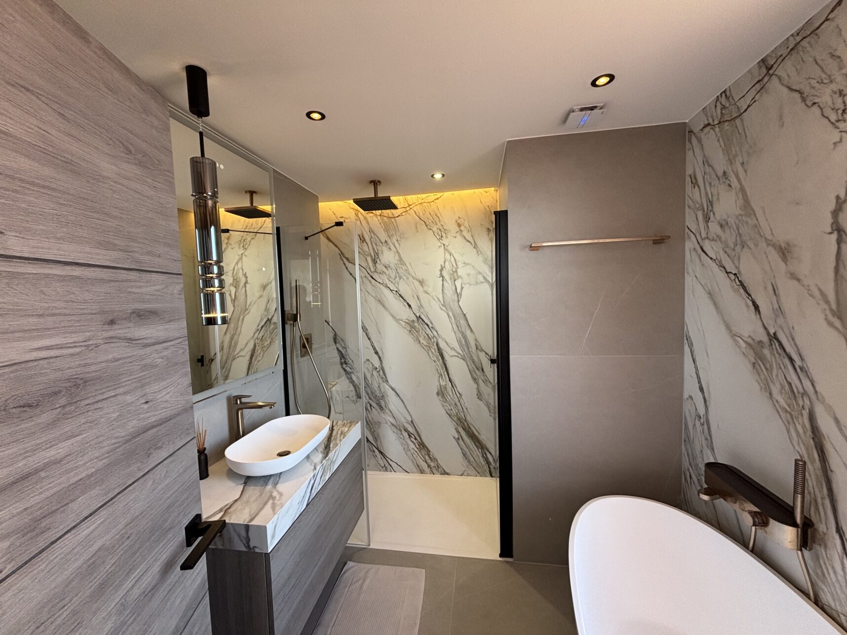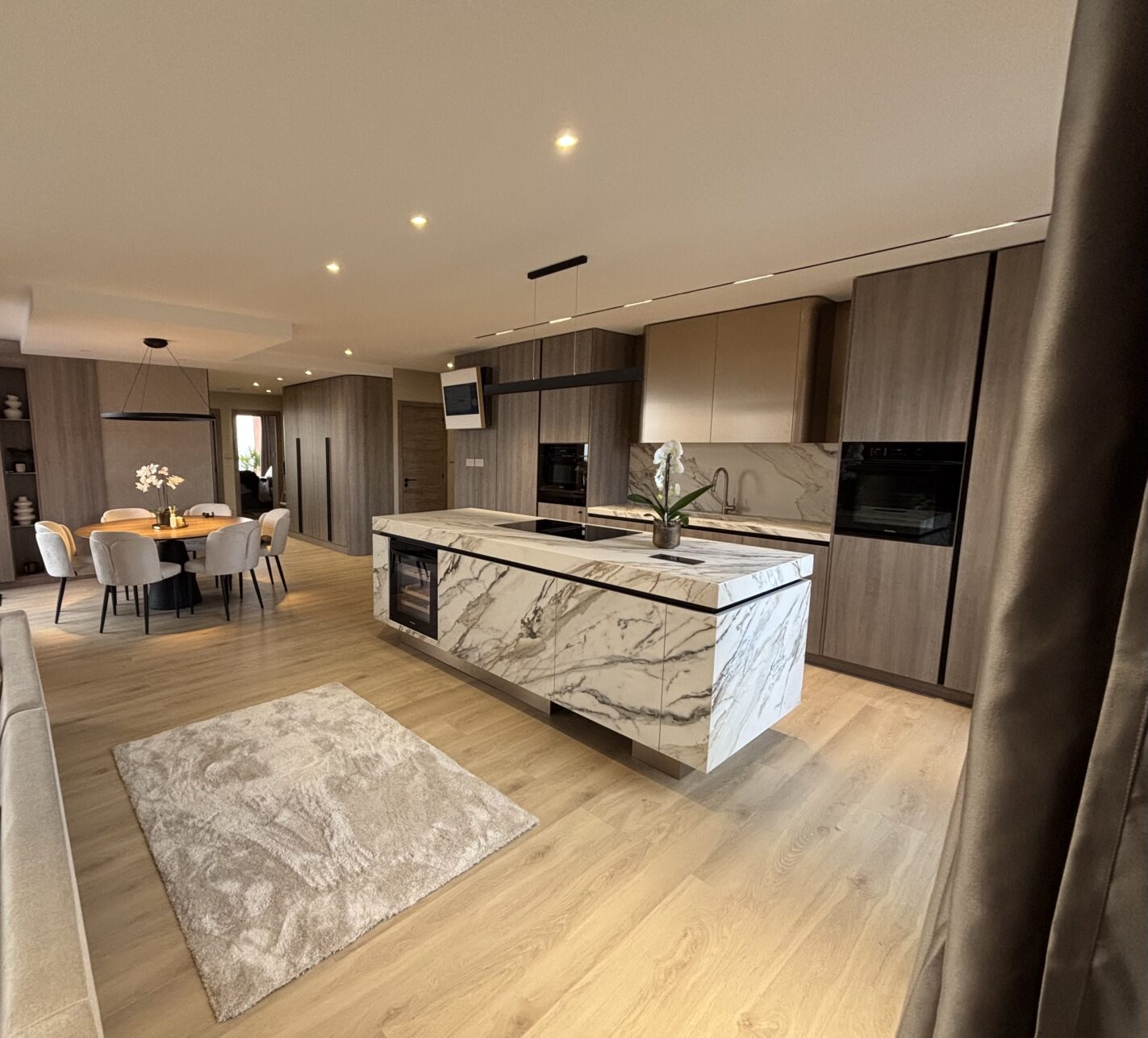 At the heart of the home lies an impressive 70 m² open-plan living, dining, and kitchen area, bathed in natural light and designed for both elegance and everyday living. The property offers three tranquil bedrooms and three stylish bathrooms, including a luxurious master suite with a freestanding designer bathtub and a wall-mounted rainfall shower. Premium materials and meticulous craftsmanship are evident throughout, from Arklam stone worktops and a striking kitchen island to Miele appliances and a built-in wine cooler. Austrian-made cabinetry and bespoke storage solutions blend seamlessly with warm Belgian flooring and Hansgrohe brushed bronze fittings, while motorised curtains and shutters enhance effortless living.